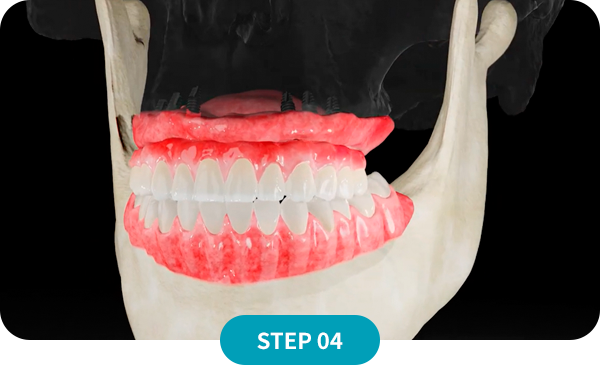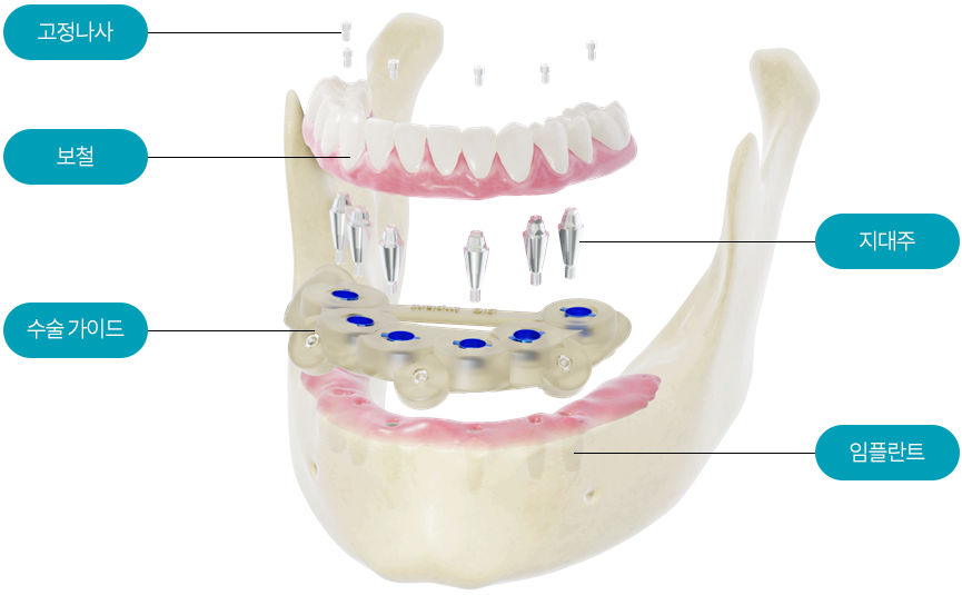 4개의 임플란트를 심고, 그 위에 보철물을 부착하는 방식.