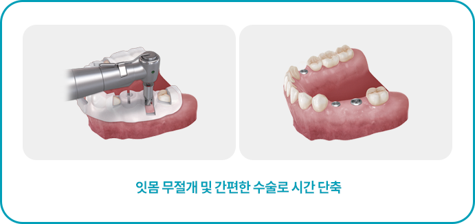 잇몸을 최소 절개하여 임플란트가 들어갈 작은 크기의 구멍을 내어 수술하기 때문에 수술 자국이 작고 출혈이 거의 없어 아프지 않습니다.